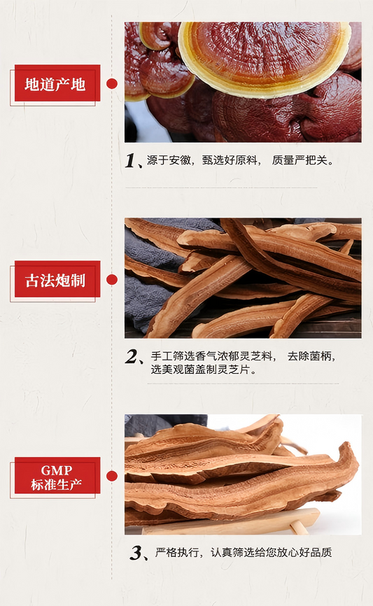 灵芝可以止咳平喘、补气安神、保肝解毒, 改善心脑循环,提高免疫力,有降糖降脂、抗肿瘤、调节免疫、抗氧化防衰 老等功效
